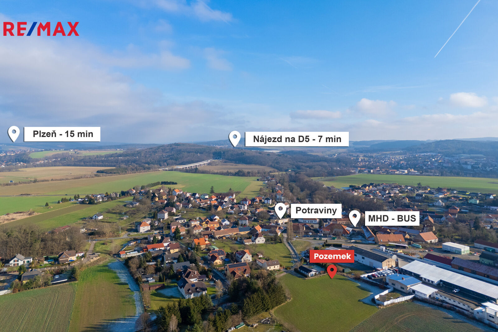 Pozemek kombinuje klid venkova s pohodlnou dostupností městských služeb. Výhodná je rovněž blízkost dálnice D5. Vzhledem ke strategické poloze nabízeného pozemku je město Plzeň snadno dostupné autem nebo veřejnou dopravou.